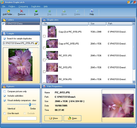 Duplicatch is a powerful, rich on features, and extremely easy to use software tool for finding and removing duplicates (copies) of files in general and pictures in particular stored on hard discs, CDs, DVDs, etc. Duplicatch provides you with power to find and reliably identify duplicates (copies, clones) of any file on your storage media not by file name or size but by its content! Pictures could be compared on the basis of their visual similarity by the unique fuzzy picture comparison engine!