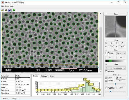 SEM Image Analyser or Semiax is a FREE statistical image analysis tool developed to automate feature counting and statistics gathering in SEM images. It has been initially developed for nano-porous materials feature analysis.